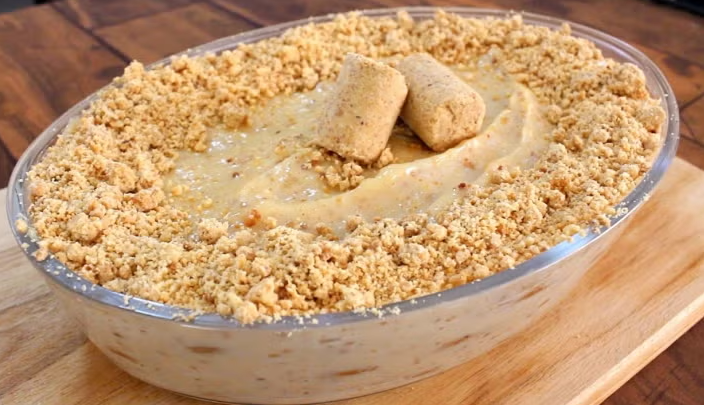 Modo de preparo: Misture o leite condensado com o creme de leite. Monte camadas alternando creme e bolacha umedecida. Leve à geladeira até firmar. Decore com paçoca por cima.